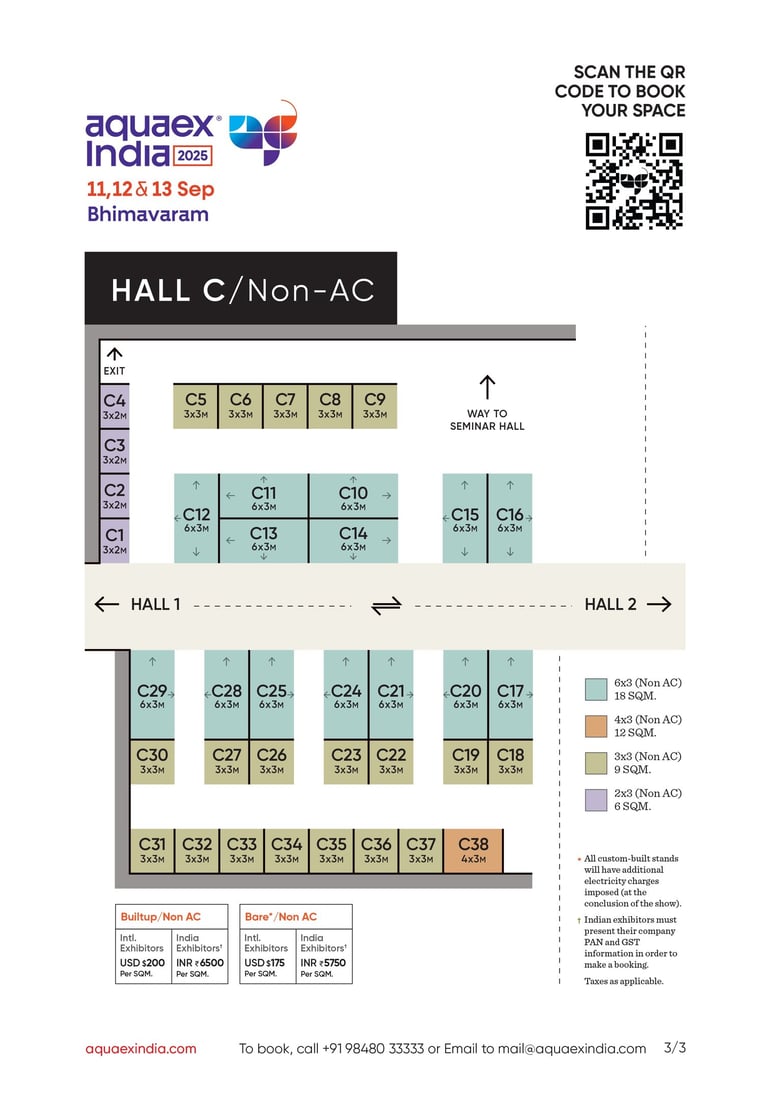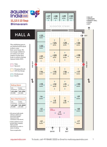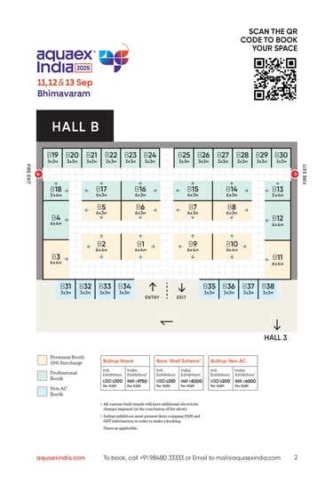 Aquaex India 2025 will be held at Radha Krishna Conventions, the largest venue in Bhimavaram. The venue includes three indoor halls: Hall-A and Hall-B are fully air-conditioned, while Hall-C is an open, non-air-conditioned space with fans. There is also outdoor space available, suitable for large machinery, vehicles, water tanks, and logistics displays. Please contact our reservation team to check booth availability.